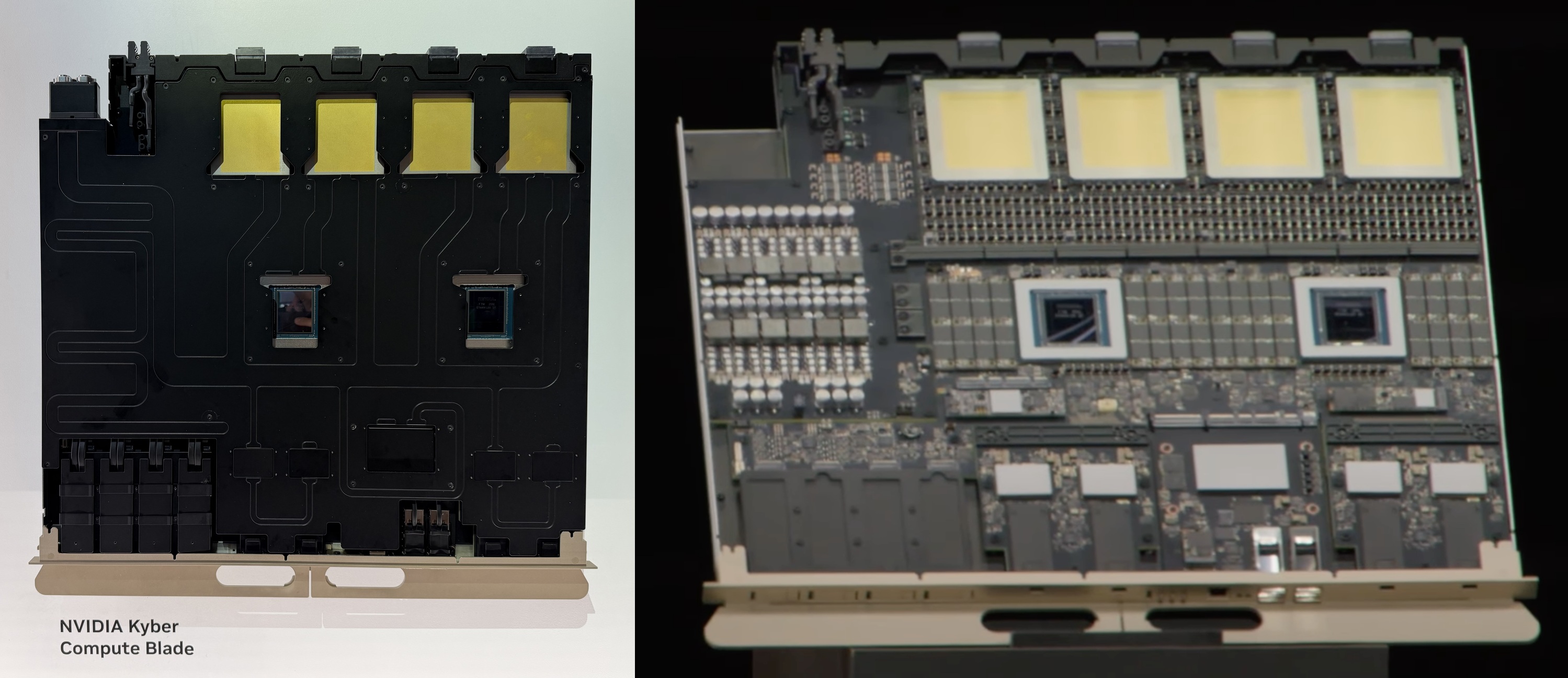 The compute trays are shown below; a lidded version was on display (left), and Jensen showed an unlidded version during his keynote (Right):