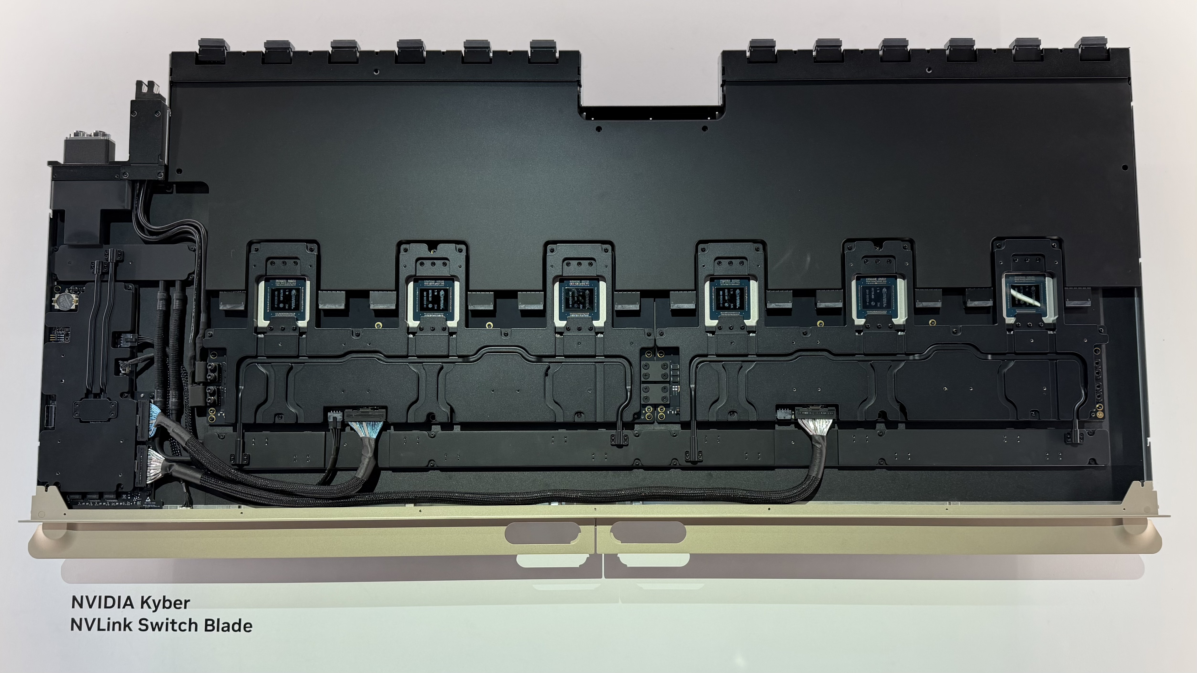 The front of the blade, with the liquid-cooled SuperNIC (top), InfiniBand transceivers (middle), and SSDs (bottom), is on the left. Four cold plates for four Rubin GPUs are on the right, and two cold plates for the Vera CPUs are to the left of them. I presume the middle is the liquid manifold, and you can see the connectors for the liquid and NVLink on the right edge of the photo.