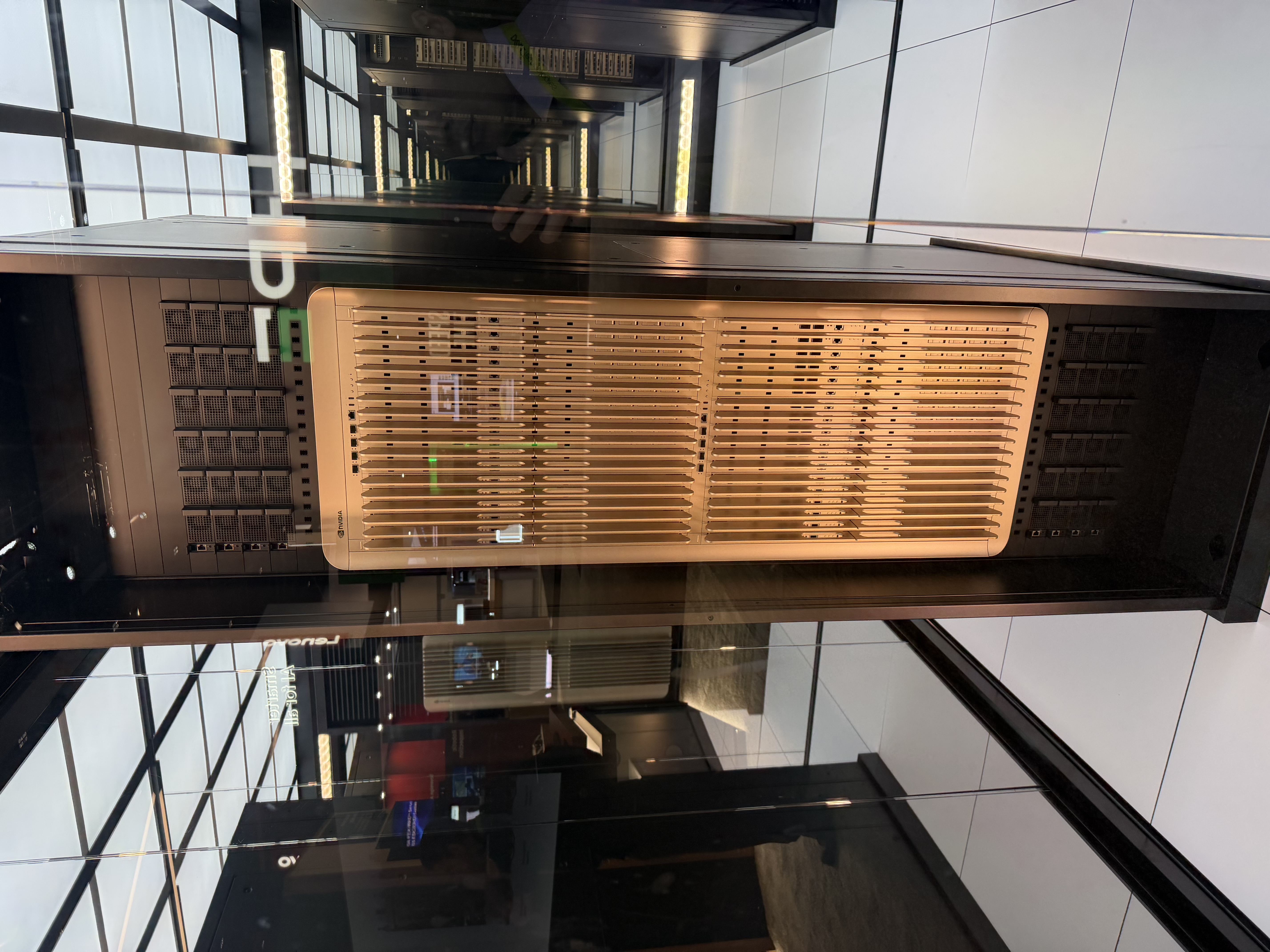 Given there are four chassis per rack, this adds up to 72 compute blades per rack and NVLink domain. This means there are 8 GPUs per compute blade; given that Rubin Ultra will have four GPUs per package, it follows that each compute blade has two GPU packages. However, a placard next to this display advertised “up to 16 GPUs” per compute blade, so I’m not sure how to reconcile those two observations.