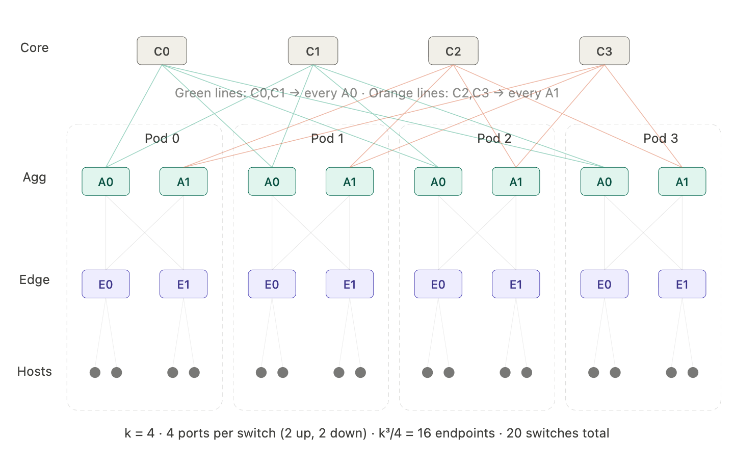 Edge and aggregation switches both use half of their ports to connect down, and the other half to connect up. The core switches use all their ports to connect down to aggregation switches.