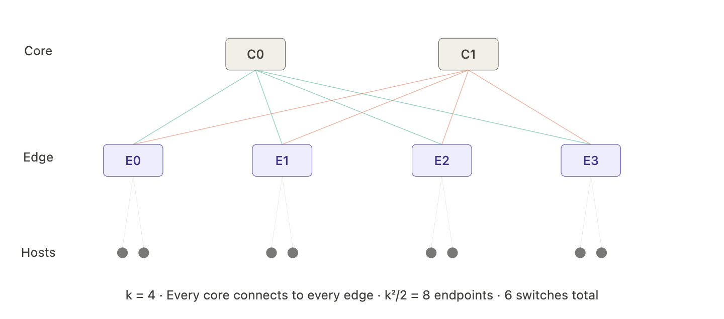 - Endpoints connect up to one of edge switches