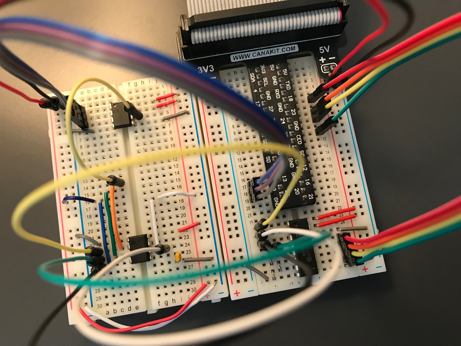 - The MCP3008 ADC is on the rightmost breadboard and the MCP41010 digipot is at the top of the leftmost breadboard.