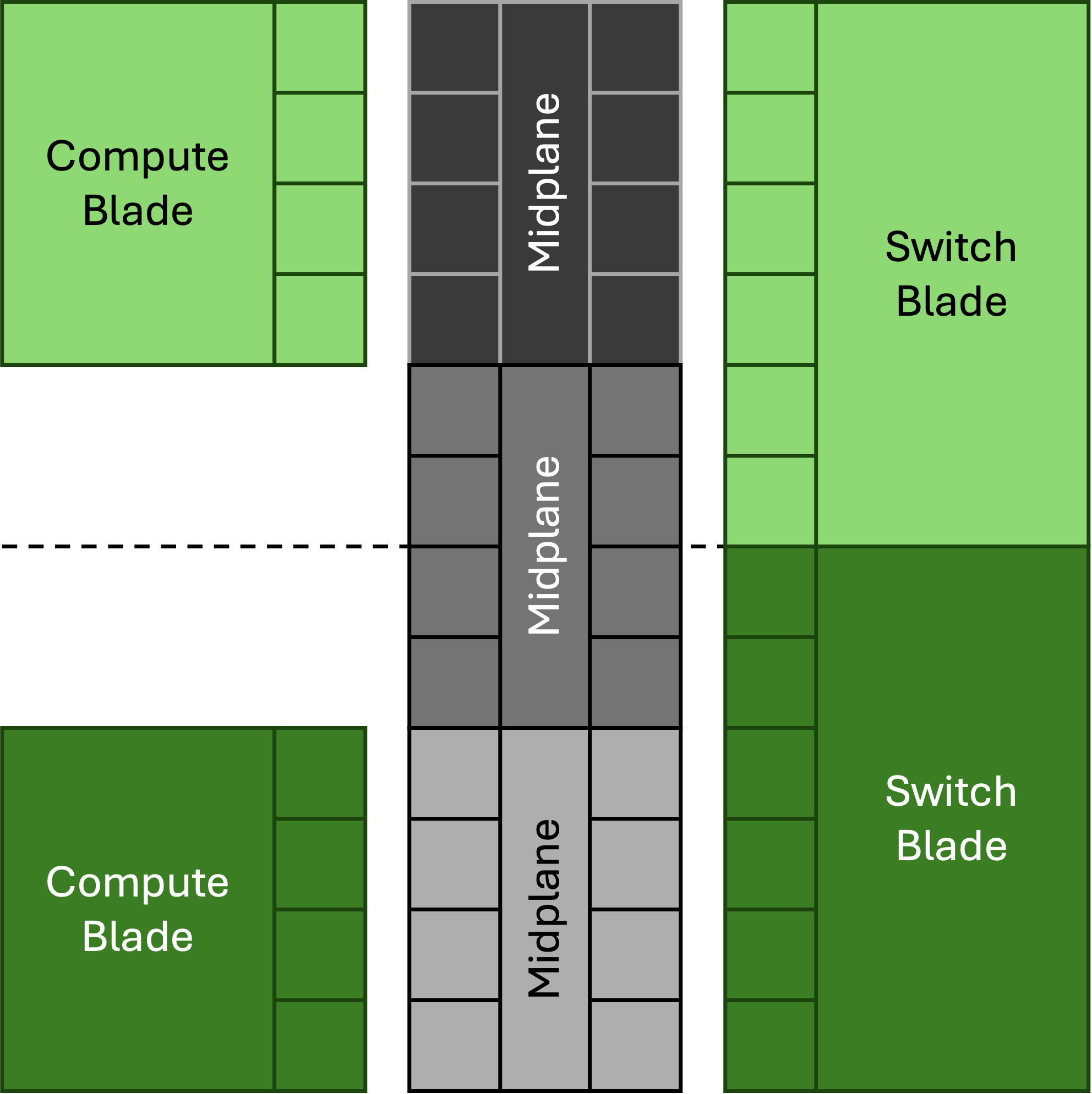 Each switch blade has six connector housings on the right; this suggests a configuration where midplanes are used to connect to both compute blades (with four housings per blade) and to straddle switch blades (with two housings per switch):