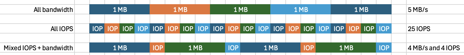 - If writes are latency-limited (e.g., 256 KiB), you can get 25 IOPS (which is still 5 MB/s)