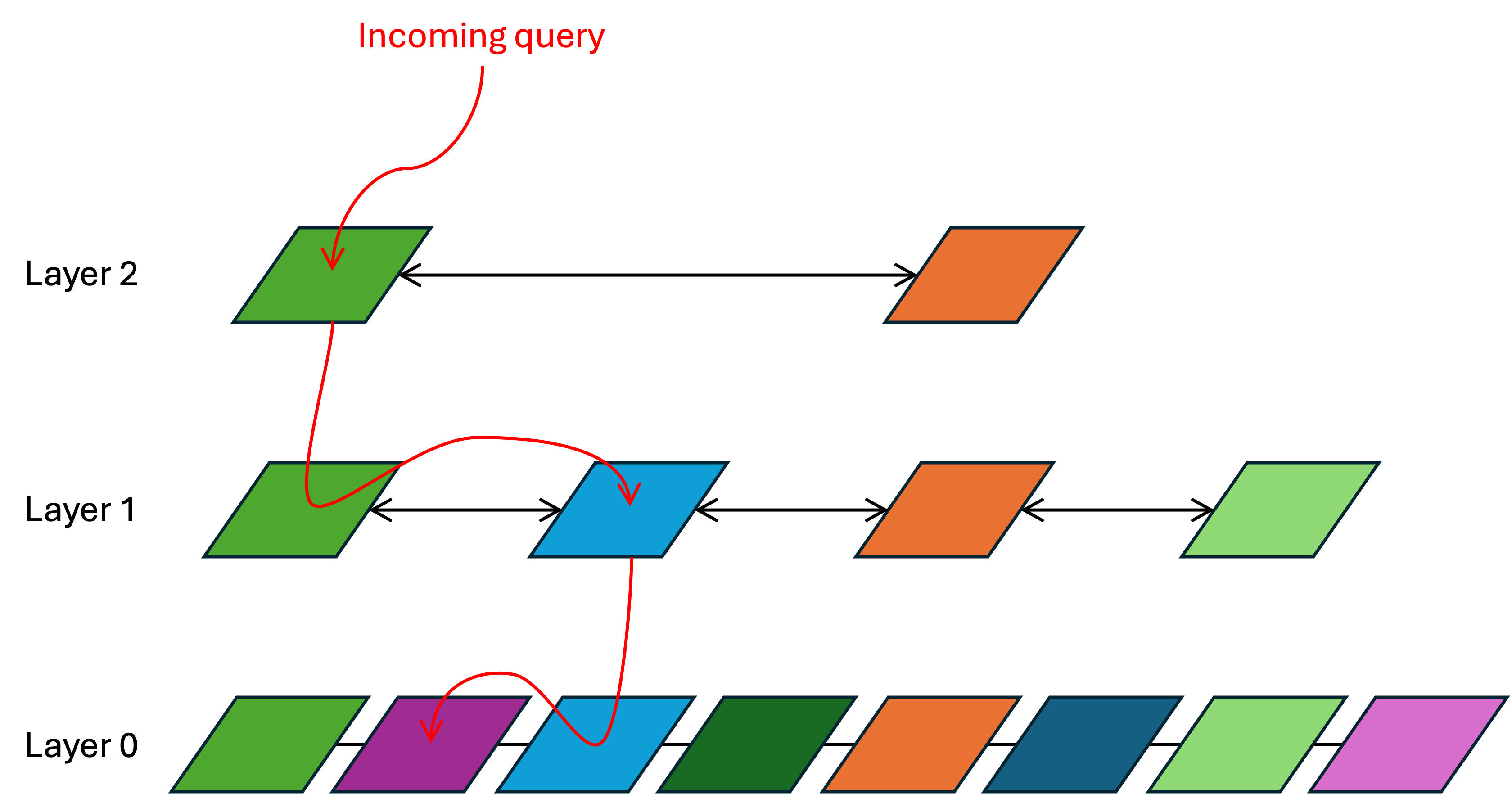 - The incoming query lands at the topmost layer (layer 2). The distance between it and every layer-2 vector is calculated. This is brute-force, but layer 2 has so few vectors in it that this calculation is still very quick. The result is that the green vector is the nearest neighbor.